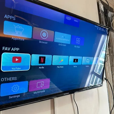 The rooms comprise a balcony and a dining area complete with an iron and air conditioning, as well as a flat-screen TV with satellite channels. They feature an electric kettle, a refrigerator, and kitchenware for self-catering. A bidet, a separate toilet, and a shower, along with such comforts as a hair dryer and bath sheets, are also provided.